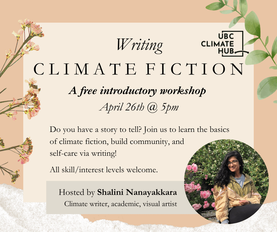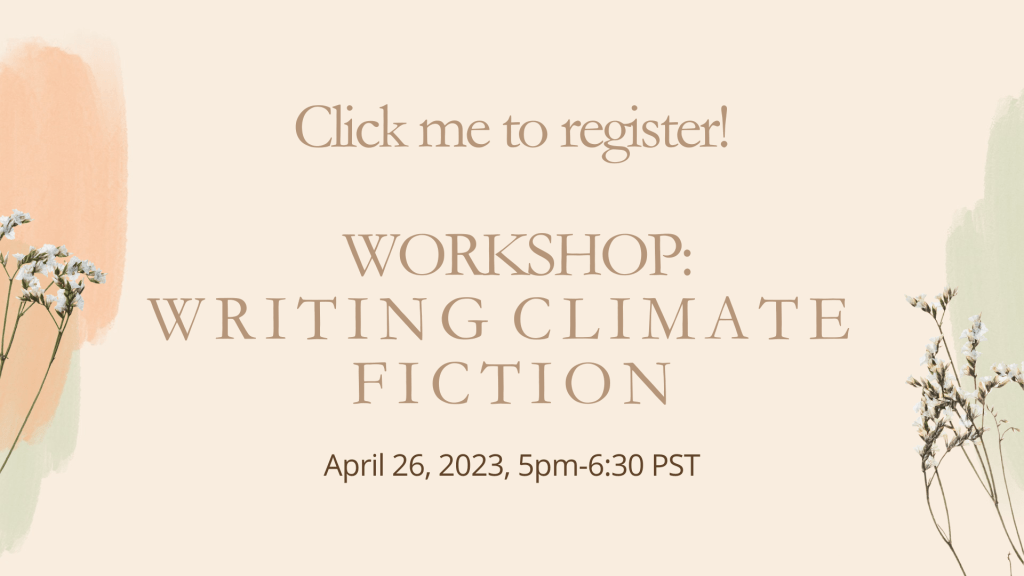 If you would like to hear more of my journey, learn from me and other curious climate fiction writers, consider joining Writing Climate Fiction: A Free Introductory Workshop, my virtual seminar with UBC Climate Hub taking place on April 26, 2023 at 5pm Pacific Time.